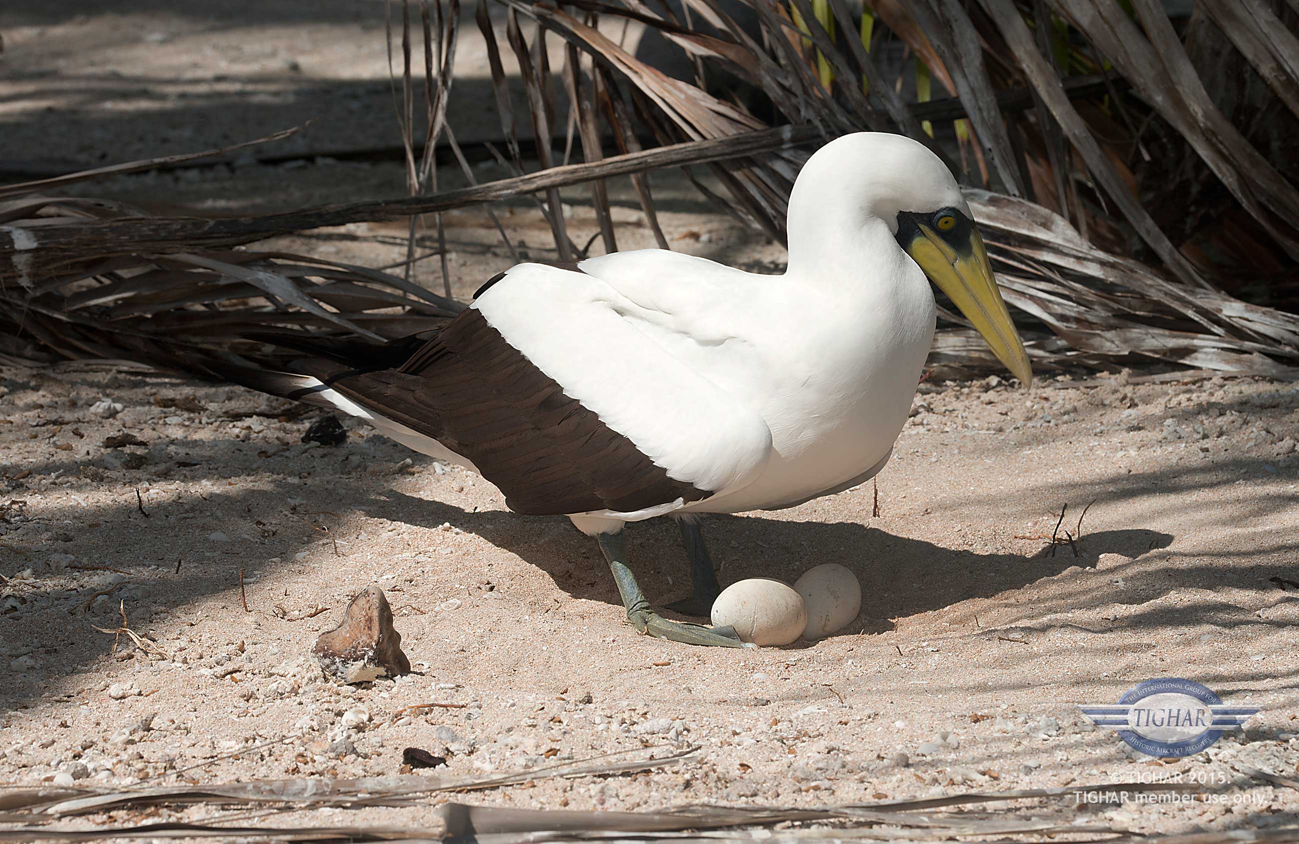 A Masked Booby tending the eggs. No ground predators, so they simply scoop out a little hollow in the sand.